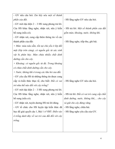 Các HS khác lắng nghe, nhận xét, nêu ý kiến - HS trả lời: Một số thành phần của đất bổ sung (nếu có).