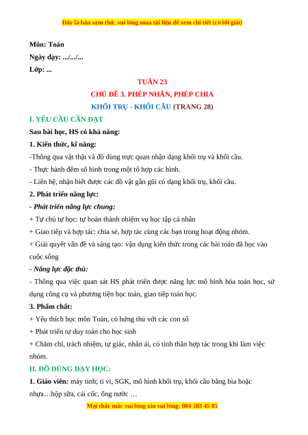 Giáo án Khối trụ - Khối cầu Toán lớp 2 Cánh diều