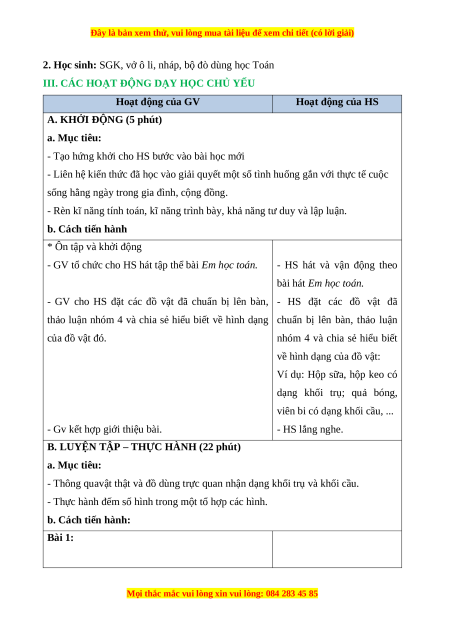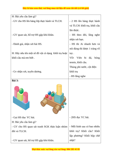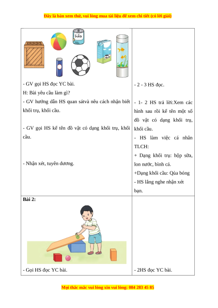 - Liên hệ, nhận biết được các đồ vật gần gũi có dạng khối trụ, khối cầu.
