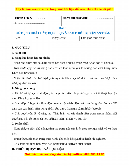 SỬ DỤNG HOÁ CHẤT, DỤNG CỤ VÀ CÁC THIẾT BỊ ĐIỆN AN TOÀN Tuần: Tiết: Ngày soạn: Thời gian thực hiện: I. MỤC TIÊU 1. Năng lực