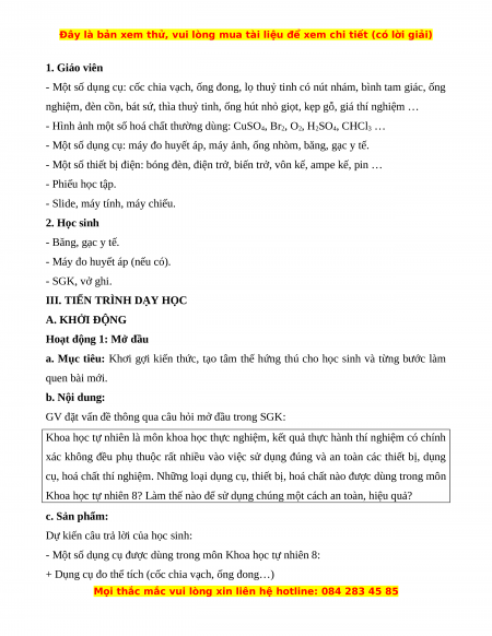 - Nhận biết được một số dụng cụ và hoá chất sử dụng trong môn Khoa học tự nhiên 8.