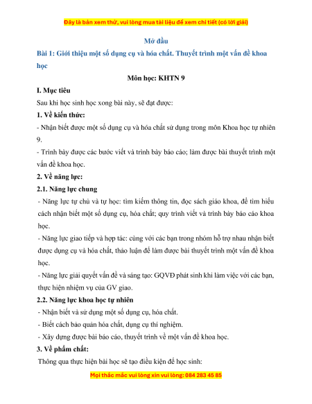 Bài 1: Giới thiệu một số dụng cụ và hóa chất. Thuyết trình một vấn đề khoa học Môn học: KHTN 9 I. Mục tiêu