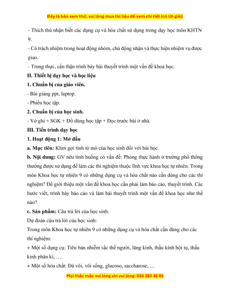 - Thích thú nhận biết các dụng cụ và hóa chất sử dụng trong dạy học môn KHTN 9.