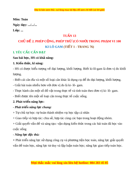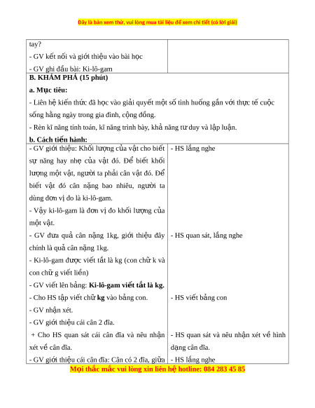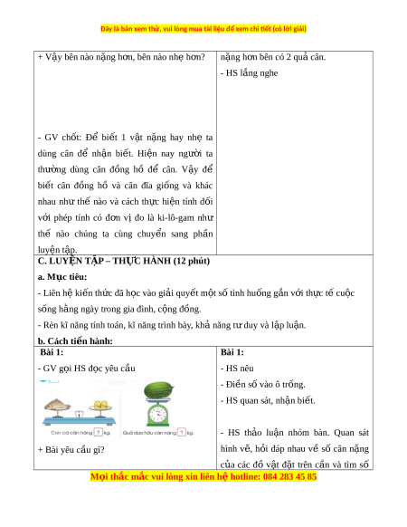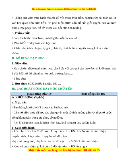 + Thông qua vi c ệ th c ự hành cân các đ ồ v t ậ trong th c ự ti n, ễ nghiên c u ứ bài toán có l i ờ văn liên quan đ n ế th c ự ti n, ễ HS phát hi n ệ đư c ợ v n ấ đề c n ầ gi i ả quy t ế , nêu và th c ự hiện đư c ợ phép tính, trả l i ờ đư c câu ợ h i ỏ c a t ủ ình hu ng. ố 3. Phẩm ch t ấ : + Yêu thích h c m ọ ôn Toán, có h ng ứ thú v i ớ các con số + Phát tri n t ể duy t ư oán cho h c s ọ inh + Chăm ch , t ỉ rách nhi m ệ , t gi