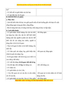 - Rèn kĩ năng tính toán, kĩ năng trình bày, kh năng t ả duy và l ư p l ậ u n. ậ b. Cách ti n h ế ành: - GV gi i ớ thi u: ệ Kh i ố lư ng ợ c a ủ v t ậ cho bi t ế - HS l ng nghe ắ sự năng hay nhẹ c a ủ v t ậ đó. Để bi t ế kh i ố lư ng ợ m t ộ v t ậ , ngư i ờ ta ph i ả cân v t ậ đó. Để bi t ế v t ậ đó cân n ng ặ bao nhiêu, ngư i ờ ta dùng đ n ơ v đo l ị à ki-lô-gam. - V y ậ ki-lô-gam là đ n ơ vị đo kh i ố lư ng ợ c a ủ m t ộ v t ậ . - GV đ a ư quả cân n ng ặ 1kg, gi i ớ thi u