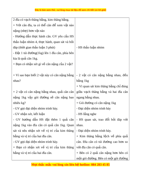 cân. Đĩa cân có túi đư ng ờ cao h n ơ so + B n ạ có nh n ậ xét về vị trí c a ủ kim thăng v i ớ đĩa cân có quả cân. b ng ằ và v t ị rí c a ủ hai đĩa cân. + Bên có 2 quả cân n ng ặ h n ơ bên có m t ộ gói đư ng. ờ Bên có m t ộ gói đư ng ờ M i ọ thắc m c vui ắ lòng xin liên h hot ệ line: 084 283 45 85