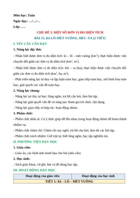 trong bài học mới “Bài 15: Ki – lô – mét vuông. Héc – ta”.
