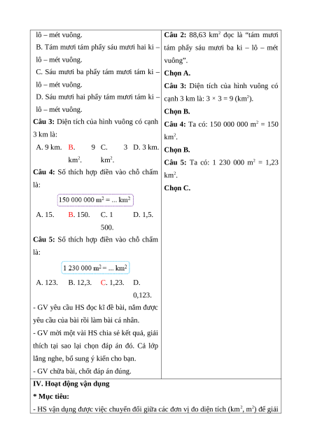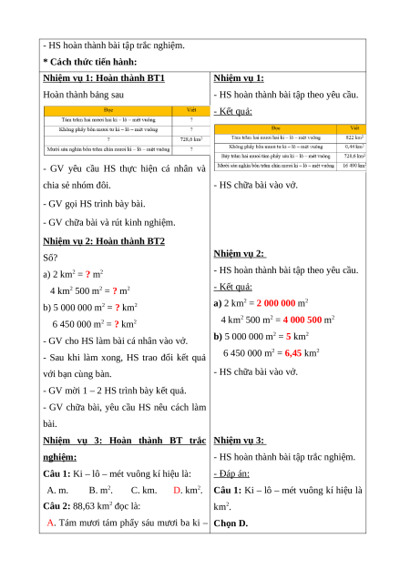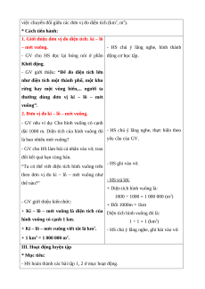 việc chuyển đổi giữa các đơn vị đo diện tích (km2, m2). * Cách tiến hành: