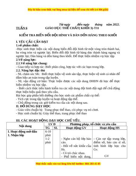 tháng năm 2022. TUẦN 6 GIÁO D C Ụ THỂ CHẤT( KH I Ố 3)-T11 KIỂM TRA BIẾN Đ I Ổ Đ I Ộ HÌNH VÀ DÀN D N Ồ HÀNG THEO KH I Ố I. YÊU CẦU CẦN ĐẠT 1.v ph ề m ẩ chất: -H c ọ sinh th c ự hi n ệ các n i ộ dung bi n ế đổi đ i ộ hình từ m t ộ vòng tròn thành hai, ba vòng tròn và ngư c ợ l i ạ ; Bi n ế đ i ổ đ i ộ hình từ hàng d c ọ thành hàng ngang và ngư c ợ l i ạ ; Dàn hàng và d n hàng ồ theo kh i ố . Đ t ể h c ự hi n nhi ệ m ệ v h ụ c ọ t p ậ 2.V năng l ề c: ự 2.1.V năng l ề c chung ự : - Giao ti p và h ế p t ợ ác: Bi t ế phân công, h p t ợ ác v i ớ các b n ạ trong l p. ớ 2.2. Năng l c đ ự c t ặ hù - NL chăm sóc SK: Bi t ế th c ự hi n ệ v ệ sinh sân t p, ậ th c ự hi n ệ v ệ sinh cá nhân để đ m ả b o an t ả oàn trong t p l ậ uy n. ệ - NL v n ậ đ ng ộ cơ b n: ả Th c ự hi n ệ đư c ợ các n i ộ dung ĐHĐN đã h c ọ để th c ự hiện nhiệm v h ụ c t ọ p ậ . - Bi t ế cách th c ứ ti n ế hành ki m ể tra các n i ộ dung đ i ộ hình đ i ộ ngũ đ ể ch ủ đ ng ộ th c ự hi n hi ệ u qu ệ ả theo yêu c u. ầ Bài h c góp ph ọ ần bồi dư ng ỡ cho h c s ọ inh các phẩm chất c t ụ hể: - Tích c c t ự rong t p l ậ uy n và ho ệ t ạ đ ng t ộ p t ậ h . ể - Ch đ ủ ng ộ trong các gi ki ờ m ể tra c a ủ các n i ộ dung sau. II. Đ D Ồ ÙNG D Y Ạ H C Ọ - Giáo viên chu n b ẩ : ị Trang ph c t ụ h t ể hao, còi ph c v ụ ụ trò ch i ơ . - H c s ọ inh chu n b ẩ :
