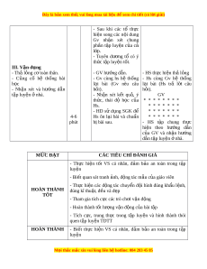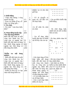 ị Giày thể thao, trang ph c ụ th t ể hao III. CÁC HOẠT Đ N Ộ G D Y Ạ H C Ọ CH Ủ Y U Ế . ươ , t ch ổ ức và yêu cầu N i ộ LV Đ Ph ng pháp dung TG SL Hoạt đ ng G ộ V Hoạt đ ng H ộ S I. Hoạt đ ng m ộ đ ở u ầ 6-10 1. Nhận l p ớ phút 1-2 - Nghe cán bộ l p ớ báo - Cán sư t p ậ trung l p, ớ phút cáo. đi m ể số, báo cáo sĩ s , ố - H i ỏ về s c ứ kh e ỏ c a ủ tình hình l p ớ h c ọ cho Hs. Gv. - Cô trò chúc nhau. - Phổ bi n ế n i ộ dung, GV M i