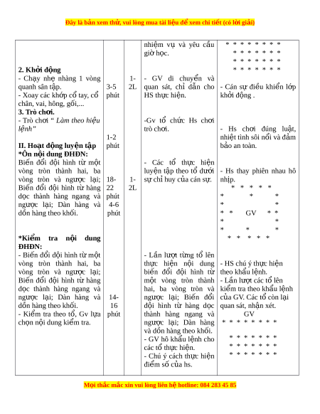 Đây là bản xem th , vu ử i lòng mua tài li u ệ đ xe ể m chi ti t (c ế ó l i ờ gi i ả ) nhiệm vụ và yêu c u ầ * * * * * * * * gi h ờ c. ọ * * * * * * * * * * * * * * 2. Kh i ở đ ng ộ * * * * * * * - Ch y ạ nhẹ nhàng 1 vòng 1- - GV di chuy n ể và quanh sân t p. ậ 3-5 2L quan sát, chỉ d n ẫ cho - Cán sự đi u ề khi n ể l p ớ - Xoay các kh p c ớ ổ tay, cổ phút HS th c hi ự n. ệ kh i ở đ ng ộ . chân, vai, hông, gối,... 3. Trò ch i ơ . - Trò ch i ơ “ Làm theo hi u ệ -Gv tổ ch c ứ Hs ch i ơ lệnh” trò ch i ơ . - Hs ch i ơ đúng lu t ậ , 1-2 nhiệt tình sôi n i ổ và đ m ả II. Hoạt đ ng l ộ uy n t ệ p ậ phút b o ả an toàn. *Ôn n i ộ dung ĐHĐN: Bi n ế đổi đ i ộ hình từ m t ộ - Các tổ th c ự hi n ệ vòng tròn thành hai, ba luyện t p ậ theo tổ dư i ớ - Hs thay phiên nhau hô vòng tròn và ngư c ợ l i ạ ; 18- 1- sự chỉ huy c a cán ủ s . ự nhịp. Bi n ế đổi đ i ộ hình từ hàng 22 2L * * * * * d c