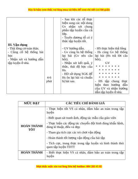 Đây là bản xem th , vu ử i lòng mua tài li u ệ đ xe ể m chi ti t (c ế ó l i ờ gi i ả ) - Sau khi các tổ th c ự hiện song các n i ộ dung Gv nh n ậ xét chung phần t p ậ luy n ệ c a ủ cả l p. ớ - Tuyên dư ng ơ tổ có ý th c ứ t p l ậ uy n t ệ ốt. III. V n d ậ ng ụ - Thả l ng c ỏ t ơ oàn thân. - GV hư ng d ớ n. ẫ - HS th c hi ự n t ệ h l ả ng ỏ - C ng ủ cố hệ th ng ố bài - Gv cùng hs hệ th ng ố - Hs cùng Gv hệ th ng ố h c ọ l i ạ bài (Gv nêu câu l i ạ bài (Hs trả l i ờ câu - Nh n ậ xét và hư ng ớ d n ẫ h i ỏ ). h i ỏ ). t p l ậ uyện nhà. ở - Nh n ậ xét k t ế qu , ả ý GV th c, ứ thái độ h c ọ c a ủ * * * * * * * * Hs. * * * * * * * - HD sử d ng ụ SGK để * * * * * * * 4-6 Hs ôn l i ạ bài và chu n ẩ * * * * * * * phút bị bài sau. - HS t p ậ chung th c ự hiện theo hư ng ớ d n ẫ c a ủ GV và nh n ậ hư ng ớ dẫn t p l ậ uyện nhà. ở M C Ứ ĐẠT