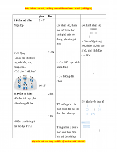 gian lần I. Phần mở đầu 5 – 7’ Nhận lớp Gv nhận lớp, thăm Đội hình nhận lớp hỏi sức khỏe học sinh phổ biến nội dung, yêu cầu giờ - Cán sự tập trung học lớp, điểm số, báo cáo sĩ số, tình hình lớp Khởi động 2x8N cho GV. - Xoay các khớp cổ tay, cổ chân, vai, - Gv HD học sinh hông, gối,... khởi động.