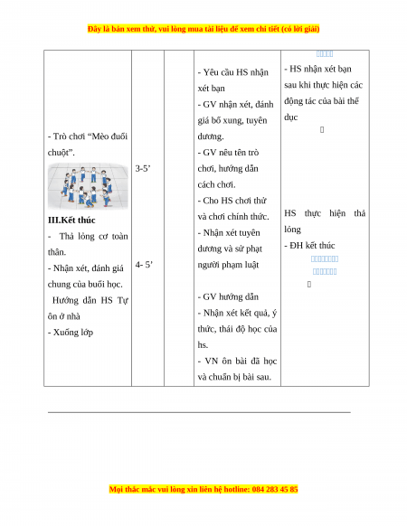 - GV nhận xét, đánh động tác của bài thể giá bổ xung, tuyên dục - Trò chơi “Mèo đuổi dương. chuột”. - GV nêu tên trò 3-5’ chơi, hướng dẫn cách chơi. - Cho HS chơi thử HS thực hiện thả III.Kết thúc và chơi chính thức. lỏng - Thả lỏng cơ toàn - Nhận xét tuyên - ĐH kết thúc thân. dương và sử phạt