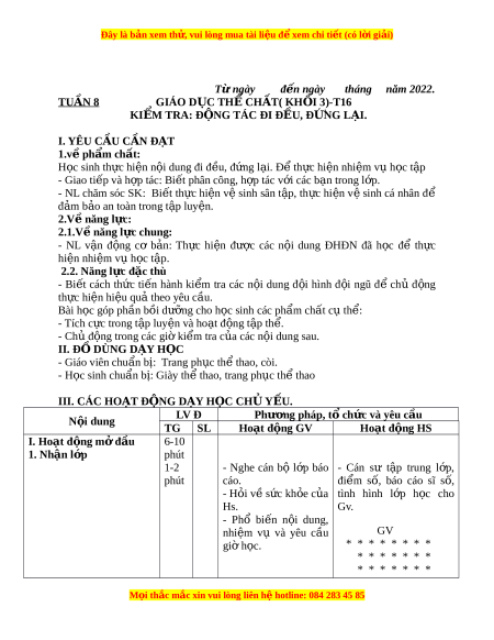 tháng năm 2022. TUẦN 8 GIÁO D C Ụ THỂ CHẤT( KH I Ố 3)-T16 KIỂM TRA: Đ N Ộ G TÁC ĐI Đ U Ề , Đ N Ứ G L I Ạ . I. YÊU CẦU CẦN ĐẠT 1.v ph ề m ẩ chất: H c ọ sinh th c hi ự n n ệ i ộ dung đi đ u, đ ề ng ứ l i ạ . Đ t ể h c hi ự n nhi ệ m ệ v h ụ c t ọ p ậ - Giao ti p và h ế p t ợ ác: Bi t ế phân công, h p t ợ ác v i ớ các b n ạ trong l p. ớ - NL chăm sóc SK: Bi t ế th c ự hi n ệ v ệ sinh sân t p, ậ th c ự hi n ệ v ệ sinh cá nhân để đ m ả b o an t ả oàn trong t p l ậ uy n. ệ 2.V năng l ề c: ự 2.1.V năng l ề c chung ự : - NL v n ậ đ ng ộ cơ b n: ả Th c ự hi n ệ đư c ợ các n i ộ dung ĐHĐN đã h c ọ để th c ự hiện nhiệm v h ụ c t ọ p ậ . 2.2. Năng l c đ ự c t ặ hù - Bi t ế cách th c ứ ti n ế hành ki m ể tra các n i ộ dung đ i ộ hình đ i ộ ngũ đ ể ch ủ đ ng ộ th c ự hi n hi ệ u qu ệ ả theo yêu c u. ầ Bài h c góp ph ọ ần bồi dư ng ỡ cho h c s ọ inh các phẩm chất c t ụ hể: - Tích c c t ự rong t p l ậ uy n và ho ệ t ạ đ ng t ộ p t ậ h . ể - Ch đ ủ ng ộ trong các gi ki ờ m ể tra c a ủ các n i ộ dung sau. II. Đ D Ồ ÙNG D Y Ạ H C Ọ - Giáo viên chu n b ẩ : ị Trang ph c t ụ h t ể hao, còi. - H c s ọ inh chu n b ẩ :