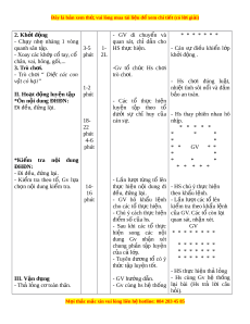 ị Giày thể thao, trang ph c ụ th t ể hao III. CÁC HOẠT Đ N Ộ G D Y Ạ H C Ọ CH Ủ Y U Ế . ươ , t ch ổ ức và yêu cầu N i ộ LV Đ Ph ng pháp dung TG SL Hoạt đ ng G ộ V Hoạt đ ng H ộ S I. Hoạt đ ng m ộ đ ở u ầ 6-10 1. Nhận l p ớ phút 1-2 - Nghe cán bộ l p ớ báo - Cán sư t p ậ trung l p, ớ phút cáo. đi m ể số, báo cáo sĩ s , ố - H i ỏ v s ề c ứ kh e c ỏ a ủ tình hình l p ớ h c ọ cho Hs. Gv. - Phổ bi n ế n i ộ dung, nhi m ệ vụ và yêu c u ầ GV gi h ờ c. ọ * * * * * * * * * * * * * * * * * * * * * * M i