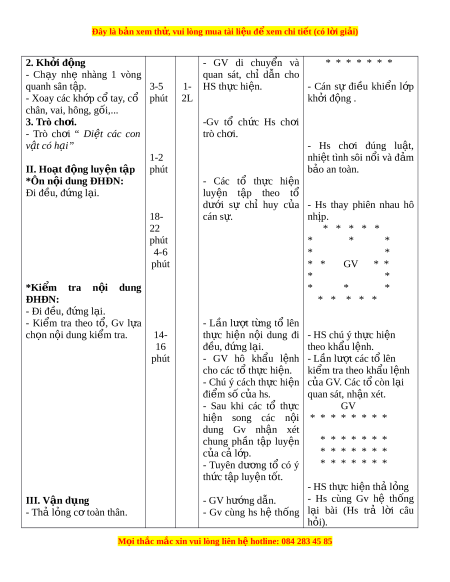 Đây là bản xem th , vu ử i lòng mua tài li u ệ đ xe ể m chi ti t (c ế ó l i ờ gi i ả ) 2. Kh i ở đ ng ộ - GV di chuy n ể và * * * * * * * - Ch y ạ nhẹ nhàng 1 vòng quan sát, chỉ d n ẫ cho quanh sân t p. ậ 3-5 1- HS th c hi ự n. ệ - Cán sự đi u ề khi n ể l p ớ - Xoay các kh p c ớ ổ tay, cổ phút 2L kh i ở đ ng . ộ chân, vai, hông, gối,... 3. Trò ch i ơ . -Gv tổ ch c ứ Hs ch i ơ - Trò ch i ơ “ Diệt các con trò ch i ơ . v t ậ có h i ạ ” - Hs ch i ơ đúng lu t ậ , 1-2 nhi t ệ tình sôi n i ổ và đ m ả II. Hoạt đ ng l ộ uy n t ệ p ậ phút b o an t ả oàn. *Ôn n i ộ dung ĐHĐN: - Các tổ th c ự hi n ệ Đi đ u, đ ề ng l ứ i ạ . luyện t p ậ theo tổ dư i ớ sự chỉ huy c a ủ - Hs thay phiên nhau hô 18- cán s . ự nhịp. 22 * * * * * phút * * * 4-6 * * phút * * GV * * * * *Ki m ể tra n i ộ dung * * * ĐHĐN: * * * * * - Đi đ u, ề đ ng l ứ i ạ . - Ki m ể tra theo tổ, Gv l a ự - L n ầ lư t ợ t ng ừ tổ lên ch n n ọ i ộ dung ki m ể tra. 14- th c ự hi n ệ n i ộ dung đi - HS chú ý th c ự hi n ệ 16 đ u, đ ề ng l ứ i ạ . theo khẩu l nh. ệ phút - GV hô kh u ẩ l nh ệ - Lần lư t ợ các tổ lên cho các tổ th c hi ự ện. ki m ể tra theo kh u l ẩ nh ệ - Chú ý cách th c ự hi n ệ c a G ủ V. Các tổ còn l i ạ đi m ể số c a hs ủ . quan sát, nh n xét ậ . - Sau khi các tổ th c ự GV hiện song các n i ộ * * * * * * * * dung Gv nh n ậ xét chung ph n ầ t p ậ luy n ệ * * * * * * * c a c ủ ả l p. ớ * * * * * * * - Tuyên dư ng ơ tổ có ý * * * * * * * th c t ứ p l ậ uyện tốt. - HS th c ự hi n t ệ hả l ng ỏ III. V n d ậ ng ụ - GV hư ng d ớ ẫn. - Hs cùng Gv hệ th ng ố - Thả l ng c ỏ t ơ oàn thân. - Gv cùng hs hệ th ng ố l i ạ bài (Hs trả l i ờ câu h i ỏ ). M i