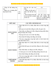 CÁC TIÊU CHÍ ĐÁNH GIÁ - Th c ự hi n ệ t t ố VS cá nhân, đ m ả b o ả an toàn trong t p ậ luyện - Bi t ế quan sát tranh nh, ả đ ng t ộ ác m u c ẫ a gi ủ áo viên - Th c ự hi n ệ các đ ng ộ tác đi đ u, ề đ ng ứ l i ạ đúng kh u ẩ l nh, ệ HOÀN THÀNH đúng kĩ thu t ậ , đ u và đ ề p ẹ TÔT - Tham gia tích c c các ự trò ch i ơ v n ậ đ ng ộ - Hoàn thành tốt lư ng ợ v n đ ậ ng c ộ a ủ bài t p ậ - Tích c c, ự trung th c ự trong t p ậ luy n ệ và hình thành thói quen t p l ậ uyện TDTT - Bi t ế th c ự hi n ệ VS cá nhân, đ m ả b o ả an toàn trong t p ậ luyện - Bư c ớ đ u ầ bi t ế quan sát tranh nh, ả đ ng ộ tác m u ẫ c a ủ giáo viên HOÀN THÀNH - Th c ự hiện đư c ợ các đ ng t ộ ác đi đ u, đ ề ng l ứ i ạ . - Có tham gia các trò ch i ơ v n ậ đ ng nh ộ ng ch ư a ư tích c c ự - Hoàn thành lư ng v ợ n ậ đ ng c ộ a bài ủ t p ậ - Tích c c ự trong t p ậ luy n ệ và bư c ớ đ u ầ hình thành thói quen t p l ậ uyện TDTT CH A Ư HOÀN - Ch a ư bi t ế th c ự hi n ệ VS cá nhân, đ m ả b o ả an toàn trong THÀNH t p l ậ uyện M i