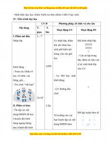 Phương pháp, tổ chức và yêu cầu Nội dung T. S. Hoạt động GV Hoạt động HS gian lần I. Phần mở đầu 5 – 7’ Nhận lớp Gv nhận lớp, thăm Đội hình nhận lớp hỏi sức khỏe học sinh phổ biến nội dung, yêu cầu giờ - Cán sự tập trung học lớp, điểm số, báo cáo sĩ số, tình hình lớp Khởi động 2x8N cho GV. - Xoay các khớp cổ tay, cổ chân, vai, - Gv HD học sinh hông, gối,... khởi động.