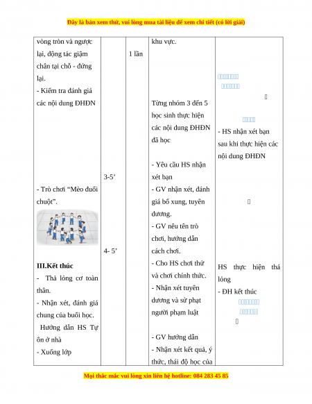 các nội dung ĐHĐN - HS nhận xét bạn đã học sau khi thực hiện các nội dung ĐHĐN - Yêu cầu HS nhận 3-5’ xét bạn - Trò chơi “Mèo đuổi - GV nhận xét, đánh chuột”. giá bổ xung, tuyên dương. - GV nêu tên trò chơi, hướng dẫn 4- 5’ cách chơi. III.Kết thúc - Cho HS chơi thử HS thực hiện thả - Thả lỏng cơ toàn và chơi chính thức. lỏng thân. - Nhận xét tuyên - ĐH kết thúc - Nhận xét, đánh giá dương và sử phạt chung của buổi học. người phạm luật Hướng dẫn HS Tự ôn ở nhà - GV hướng dẫn - Xuống lớp - Nhận xét kết quả, ý