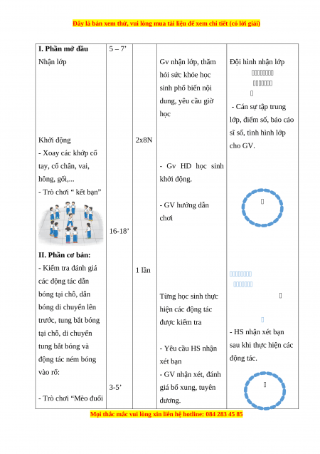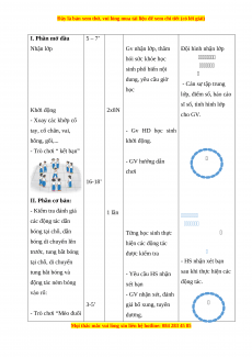 I. Phần mở đầu 5 – 7’ Nhận lớp Gv nhận lớp, thăm Đội hình nhận lớp hỏi sức khỏe học sinh phổ biến nội dung, yêu cầu giờ - Cán sự tập trung học lớp, điểm số, báo cáo sĩ số, tình hình lớp Khởi động 2x8N cho GV. - Xoay các khớp cổ tay, cổ chân, vai, - Gv HD học sinh hông, gối,... khởi động.