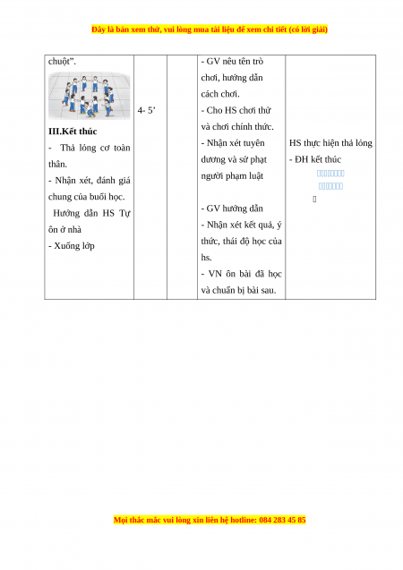 chuột”. - GV nêu tên trò chơi, hướng dẫn cách chơi. 4- 5’ - Cho HS chơi thử III.Kết thúc và chơi chính thức. - Thả lỏng cơ toàn - Nhận xét tuyên HS thực hiện thả lỏng thân. dương và sử phạt - ĐH kết thúc - Nhận xét, đánh giá người phạm luật chung của buổi học. Hướng dẫn HS Tự - GV hướng dẫn ôn ở nhà - Nhận xét kết quả, ý - Xuống lớp