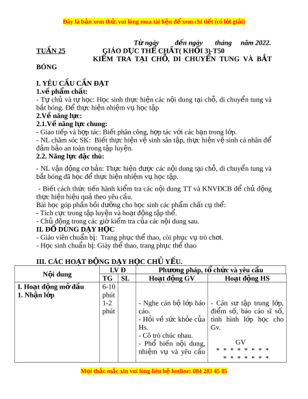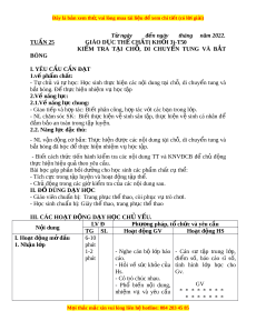 tháng năm 2022. TUẦN 25 GIÁO D C Ụ THỂ CHẤT( KH I Ố 3)-T50 KIỂM TRA TẠI CH , Ỗ DI CHUY N Ể TUNG VÀ B T Ắ BÓNG I. YÊU CẦU CẦN ĐẠT 1.v ph ề m ẩ chất: - Tự chủ và tự h c: ọ H c ọ sinh th c ự hi n ệ các n i ộ dung t i ạ ch , ỗ di chuy n ể tung và b t ắ bóng. Đ t ể h c hi ự n nhi ệ m ệ v h ụ c t ọ p ậ 2.V năng l ề c: ự 2.1.V năng l ề c chung ự : - Giao ti p và h ế p t ợ ác: Bi t ế phân công, h p t ợ ác v i ớ các b n ạ trong l p. ớ - NL chăm sóc SK: Bi t ế th c ự hi n ệ v ệ sinh sân t p, ậ th c ự hi n ệ v ệ sinh cá nhân để đ m ả b o an t ả oàn trong t p l ậ uy n. ệ 2.2. Năng l c đ ự c t ặ hù: - NL v n ậ đ ng ộ cơ b n: ả Th c ự hi n ệ đư c ợ các n i ộ dung t i ạ ch , ỗ di chuy n ể tung và b t ắ bóng đã h c ọ đ t ể h c ự hi n nhi ệ m ệ v h ụ c ọ t p ậ . - Bi t ế cách th c ứ ti n ế hành ki m ể tra các n i