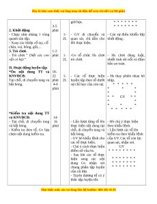ị Giày thể thao, trang ph c ụ th t ể hao III. CÁC HOẠT Đ N Ộ G D Y Ạ H C Ọ CH Ủ Y U Ế . ươ , t ch ổ ức và yêu cầu N i ộ LV Đ Ph ng pháp dung TG SL Hoạt đ ng G ộ V Hoạt đ ng H ộ S I. Hoạt đ ng m ộ đ ở u ầ 6-10 1. Nhận l p ớ phút 1-2 - Nghe cán bộ l p ớ báo - Cán sư t p ậ trung l p, ớ phút cáo. đi m ể số, báo cáo sĩ s , ố - H i ỏ về s c ứ kh e ỏ c a ủ tình hình l p ớ h c ọ cho Hs. Gv. - Cô trò chúc nhau. - Phổ bi n ế n i ộ dung, GV nhi m ệ vụ và yêu c u ầ * * * * * * * * * * * * * * * M i