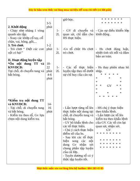 Đây là bản xem th , vu ử i lòng mua tài li u ệ đ xe ể m chi ti t (c ế ó l i ờ gi i ả ) gi h ờ c. ọ * * * * * * * 3-5 * * * * * * * 2. Kh i ở đ ng ộ phút - Ch y ạ nhẹ nhàng 1 vòng 1- - GV di chuy n ể và - Cán sự đi u ề khi n ể l p ớ quanh sân t p. ậ 2L quan sát, chỉ d n ẫ cho kh i ở đ ng . ộ - Xoay các kh p c ớ ổ tay, cổ HS th c hi ự n. ệ chân, vai, hông, gối,... 3. Trò ch i ơ . 1-2 - Trò ch i ơ “ Di t ệ các con phút 1- -Gv tổ ch c ứ Hs ch i ơ - Hs ch i ơ đúng lu t ậ , v t ậ có h i ạ ” 2L trò ch i ơ . nhi t ệ tình sôi n i ổ và đ m ả b o an t ả oàn. II. Hoạt đ ng l ộ uy n t ệ p ậ *Ôn n i ộ dung TT và 18- KNVĐCB: 22 1- - Các tổ th c ự hi n ệ - Hs thay phiên nhau hô T i ạ ch , ỗ di chuy n ể tung và phút 2L luyện t p ậ theo tổ dư i ớ nhịp. b t ắ bóng. 4-6 s ch ự ỉ huy c a ủ cán s . ự * * * * * phút * * * * * * * GV * * * * * * * * * * * * *Ki m ể tra n i ộ dung TT và KNVĐCB: 14- - T i ạ ch , ỗ di chuy n ể tung 16 - L n ầ lư t ợ t ng