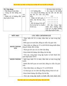 ộ tác TT và KNVĐCB đúng kh u ẩ l nh, ệ HOÀN THÀNH đúng kĩ thu t ậ , đ u và đ ề p ẹ TÔT - Tham gia tích c c các ự trò ch i ơ v n ậ đ ng ộ - Hoàn thành tốt lư ng ợ v n đ ậ ng c ộ a ủ bài t p ậ - Tích c c, ự trung th c ự trong t p ậ luy n ệ và hình thành thói quen t p l ậ uyện TDTT HOÀN THÀNH - Bi t ế th c ự hi n ệ VS cá nhân, đ m ả b o ả an toàn trong t p ậ luyện - Bư c ớ đ u ầ bi t ế quan sát tranh nh, ả đ ng ộ tác m u ẫ c a ủ giáo viên - Th c ự hiện đư c ợ các đ ng t ộ ác TT và KNVĐCB - Có tham gia các trò ch i ơ v n ậ đ ng nh ộ ng ch ư a ư tích c c ự - Hoàn thành lư ng v ợ n ậ đ ng c ộ a bài ủ t p ậ - Tích c c ự trong t p ậ luy n ệ và bư c ớ đ u ầ hình thành thói M i
