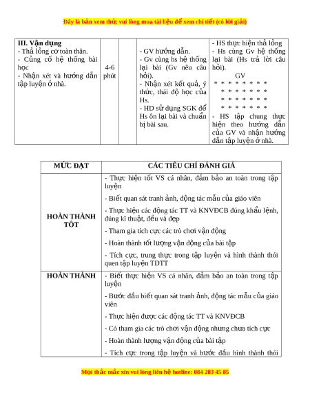 Đây là bản xem th , vu ử i lòng mua tài li u ệ đ xe ể m chi ti t (c ế ó l i ờ gi i ả ) III. V n d ậ ng ụ - HS th c ự hi n t ệ hả l ng ỏ - Thả l ng c ỏ t ơ oàn thân. - GV hư ng d ớ ẫn. - Hs cùng Gv hệ th ng ố - C ng ủ cố hệ th ng ố bài - Gv cùng hs hệ th ng ố l i ạ bài (Hs trả l i ờ câu h c ọ 4-6 l i ạ bài (Gv nêu câu h i ỏ ). - Nh n ậ xét và hư ng ớ d n ẫ phút h i ỏ ). GV t p l ậ uyện nhà. ở - Nh n ậ xét k t ế qu , ả ý * * * * * * * * th c, ứ thái độ h c ọ c a ủ * * * * * * * Hs. * * * * * * * - HD sử d ng ụ SGK để * * * * * * * Hs ôn l i ạ bài và chu n ẩ - HS t p ậ chung th c ự bị bài sau. hiện theo hư ng ớ d n ẫ c a ủ GV và nh n ậ hư ng ớ dẫn t p l ậ uy n ệ nhà. ở M C Ứ ĐẠT