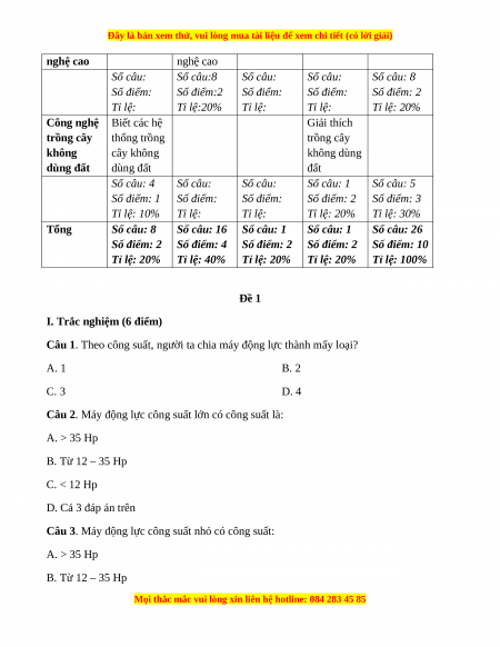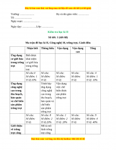 Công nghệ Biết các hệ Giải thích trồng cây thống trồng trồng cây không cây không không dùng dùng đất dùng đất đất Số câu: 4 Số câu: Số câu: Số câu: 1 Số câu: 5 Số điểm: 1 Số điểm: Số điểm: Số điểm: 2 Số điểm: 3 Tỉ lệ: 10% Tỉ lệ: Tỉ lệ: Tỉ lệ: 20% Tỉ lệ: 30% Tổng Số câu: 8 Số câu: 16 Số câu: 1 Số câu: 1 Số câu: 26 Số điểm: 2 Số điểm: 4 Số điểm: 2 Số điểm: 2 Số điểm: 10 Tỉ lệ: 20% Tỉ lệ: 40% Tỉ lệ: 20% Tỉ lệ: 20% Tỉ lệ: 100% Đề 1
