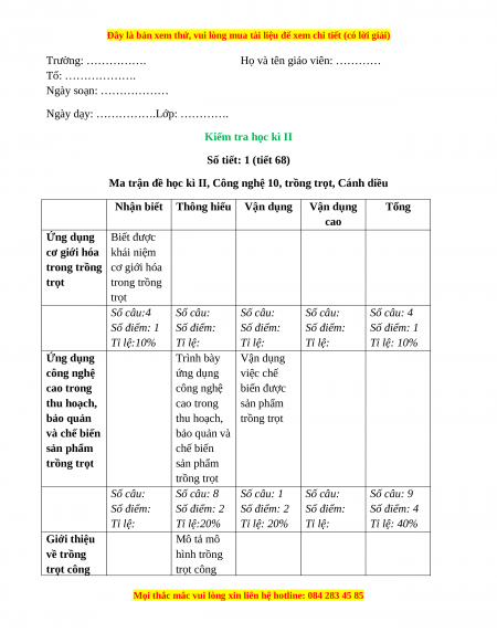 Ma trận đề học kì II, Công nghệ 10, trồng trọt, Cánh diều