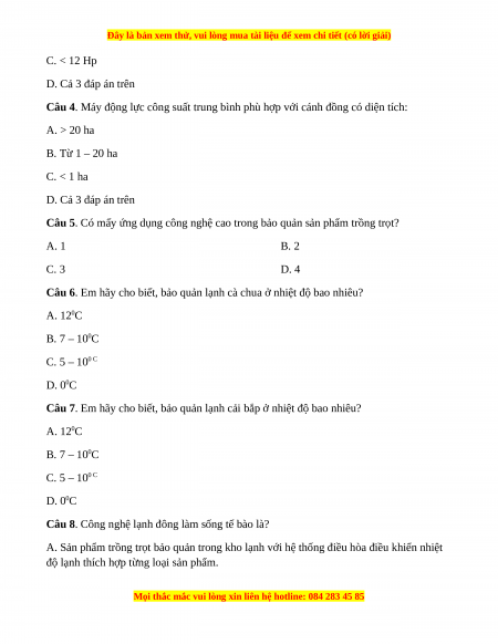 Câu 7. Em hãy cho biết, bảo quản lạnh cải bắp ở nhiệt độ bao nhiêu? A. 120C B. 7 – 100C C. 5 – 100 C D. 00C