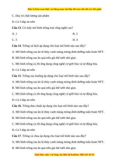 Câu 13. Có mấy mô hình trồng trọt công nghệ cao?