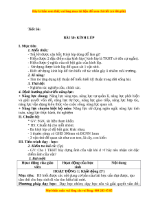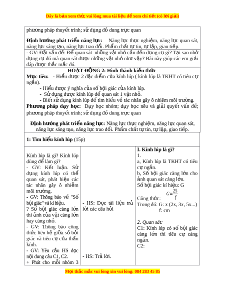 ề ác nhân gây ô nhiêm môi trư ng. ờ Phư ng ơ pháp d y ạ h c: ọ D y ạ h c ọ nhóm; d y ạ h c ọ nêu và gi i ả quy t ế v n ấ đề; phư ng ơ pháp thuy t ế trình; s d ử ng đ ụ ồ dung tr c ự quan Đ nh h ị ư ng phá ớ t tri n năng l ể c: ự Năng l c t ự h c ự nghi m ệ , năng l c ự quan sát, năng l c ự sáng t o, ạ năng l c t ự rao đ i ổ . Ph m ẩ ch t ấ t t ự in, t l ự p, gi ậ ao ti p. ế 1: Tìm hi u kí ể nh lúp (15p) I. Kính lúp là gì? Kính lúp là gì? Kính lúp 1. dùng đ l ể àm gì?