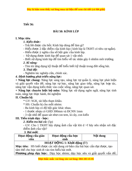 Đây là bản xem th , vu ử i lòng mua tài li u ệ đ xe ể m chi ti t (c ế ó l i ờ gi i ả ) Ti t ế 56: BÀI 50: KÍNH LÚP I. M c t ụ iêu 1. Ki n ế th c: ứ - Tr l ả i ờ đư c ợ câu h i ỏ : Kính lúp dùng đ l ể àm gì? - Hi u đ ể ư c ợ 2 đ c đi ặ m ể c a