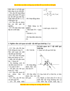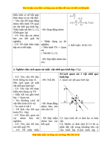 Đây là bản xem th , vu ử i lòng mua tài li u ệ đ xe ể m chi ti t (c ế ó l i ờ gi i ả ) th u ấ kính có số b i ộ giác 25 G khác nhau và các v t ậ nh . ỏ = f =1,5 + Yêu c u ầ HS ho t ạ đ n ộ g 25 25 nhóm ti n ế hành TN quan ⇔ f = = ≈16 , 7(cm) G 1,5 sát v t ậ nhỏ qua kính lúp. Th o l ả u n t ậ r l ả i ờ C1, C2. - HS: Ho t ạ đ n ộ g nhóm (Th i ờ gian: 5p) - GV: Yêu c u ầ các nhóm báo cáo k t ế quả thí nghi m ệ . + Nh n ậ d n ụ g cụ thí - GV: Tổ ch c ứ th o ả lu n ậ nghi m ệ . 3. K t ế lu n: ậ SGK/133 l p ớ rút ra k t ế lu n ậ . + Ti n ế hành TN -> Quan sát + Tr ả l i ờ C1, C2. - HS: Đ i ạ di n ệ nhóm báo cáo. 2: Nghiên c u c ứ ách quan sát m t ộ v t ậ nh qua kí ỏ nh lúp (15p)