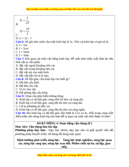 Câu 4: Trong các kính lúp sau, kính lúp nào khi dùng đ quan ể sát m t ộ v t ậ s ẽ cho nh ả l n nh ớ ất? A. Kính lúp có số b i ộ giác G = 5. B. Kính lúp có s b ố i ộ giác G = 5,5. C. Kính lúp có s b ố i ộ giác G = 4. D. Kính lúp có số b i ộ giác G = 6 Câu 5: Số b i ộ giác và tiêu c ự (đo b ng ằ đ n ơ v ịxentimet) c a ủ m t ộ kính lúp có hệ th c: ứ A. G = 25f M i ọ thắc m c