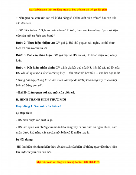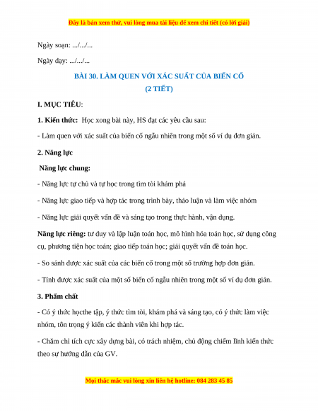 BÀI 30. LÀM QUEN VỚI XÁC SUẤT CỦA BIẾN CỐ (2 TIẾT) I. MỤC TIÊU: