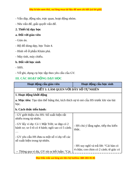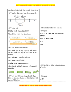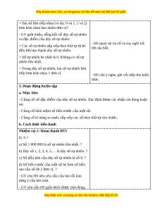 - Vấn đáp, đ ng ộ não, tr c ự quan, ho t ạ đ ng nhóm ộ . - Nêu vấn đ , gi ề i ả quy t ế v n đ ấ . ề 2. Thi t ế b d ị y h ạ c ọ a. Đ i ố v i ớ giáo viên - Giáo án. - Bộ đồ dùng d y ạ , h c ọ Toán 4. - Hình v ẽ ph ở n K ầ hám phá. - Máy tính, máy chi u. ế b. Đ i ố v i ớ h c s ọ inh - SHS. - Vở ghi, d ng c ụ h ụ c ọ t p t ậ heo yêu c u c ầ a ủ GV. III. CÁC HO T Ạ Đ N Ộ G D Y Ạ H C Ọ Hoạt đ ng c ộ a gi ủ áo viên Hoạt đ ng c ộ a h ủ c s ọ inh TIẾT 1: LÀM QUEN V I Ớ DÃY S Ố TỰ NHIÊN 1. Hoạt đ ng kh ộ i ở đ ng ộ a. Mục tiêu: T o t ạ âm th h ế ng t ứ