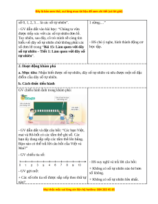 số tự nhiên – Ti t ế 1: Làm quen v i ớ dãy s ố tự nhiên”. 2. Hoạt đ ng khá ộ m phá a. Mục tiêu: Nh n bi ậ t ế đư c ợ số t nhi ự ên, dãy số t nhi ự ên và nêu đư c ợ m t ộ s đ ố c ặ đi m ể c a dãy s ủ ố t nhi ự ên. b. Cách th c t ứ i n hành ế GV chi u ế hình nh t ả rong khám phá: - GV dẫn d t ắ và đ t ặ câu h i ỏ : “Các b n ạ Vi t ệ , mai và Rô-bốt có các t m ấ th gh ẻ i s . ố Các b n ạ ấy đang s p x ắ p các ế t m ấ th l ẻ ên b ng. ả B n ạ nào có th t ể r l ả i ờ câu h i ỏ c a ủ Vi t ệ và Mai?” - GV chi u t ế ia số: - HS suy nghĩ và tr l ả i ờ câu h i ỏ : + Không có số t nhi ự ên nào bé h n ơ - GV g i ợ m : ở số không. + Các số trên tia s đ ố ược s p x ắ p t ế heo th t