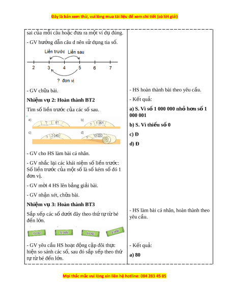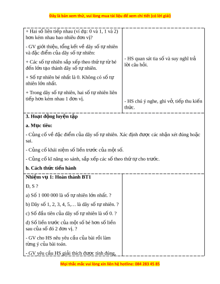 + Hai số liên ti p nhau ( ế ví d : ụ 0 và 1, 1 và 2) h n kém ơ nhau bao nhiêu đ n v ơ ? ị - GV gi i ớ thi u, t ệ ổng k t ế về dãy số t nhi ự ên và đ c ặ đi m ể c a dãy s ủ ố tự nhiên: - HS quan sát tia s và s ố uy nghĩ tr ả + Các số t nhi ự ên s p ắ x p t ế heo th t ứ t ự bé ừ l i ờ câu h i ỏ . đ n l ế n t ớ o ạ thành dãy s t ố nhi ự ên. + Số t nhi ự ên bé nh t ấ là 0. Không có s t ố ự nhiên l n nh ớ ất. + Trong dãy số t nhi ự ên, hai số t nhi ự ên liên ti p h ế n kém ơ nhau 1 đ n ơ v . ị - HS chú ý nghe, ghi v , t ở i p t ế hu ki n ế th c. ứ 3. Hoạt đ ng l ộ uy n t ệ p ậ a. Mục tiêu: - C ng ủ cố v đ ề c ặ đi m ể c a dãy s ủ ố t nhi ự ên. Xác đ nh đ ị ư c các ợ nh n xét ậ đúng ho c ặ sai. - C ng ủ cố khái ni m ệ số li n t ề rư c ớ c a m ủ t ộ số. - C ng