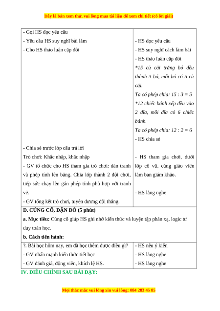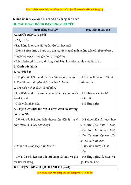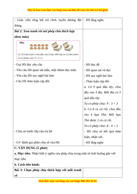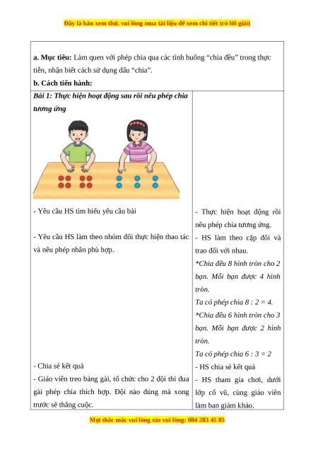 - Làm quen với phép chia qua các tình huống “chia đều” trong thực tiễn, nhận biết