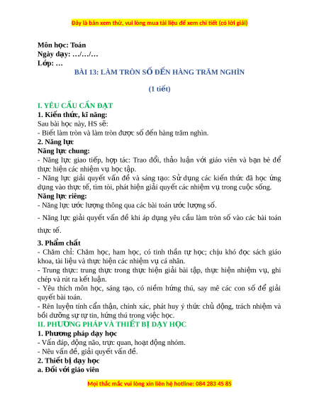 ầ làm tròn số vào các bài toán th c ự t . ế 3. Phẩm ch t ấ - Chăm ch : ỉ Chăm h c, ọ ham h c, ọ có tinh th n ầ tự h c; ọ ch u ị khó đ c ọ sách giáo khoa, tài li u và t ệ h c ự hi n các ệ nhi m ệ vụ cá nhân. - Trung th c: ự trung th c ự trong th c ự hi n ệ gi i ả bài t p, ậ th c ự hi n ệ nhi m ệ v , ụ ghi chép và rút ra k t ế lu n. ậ - Yêu thích môn h c, ọ sáng t o, ạ có ni m ề h ng