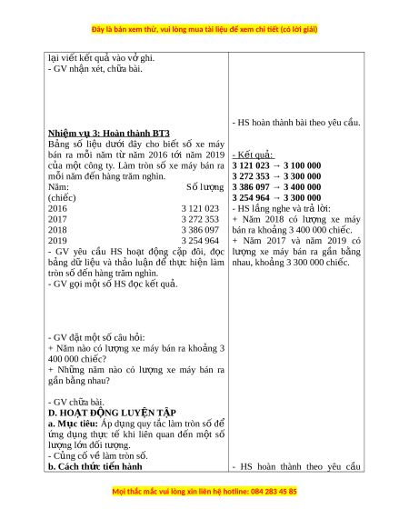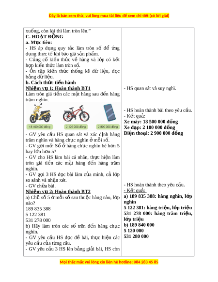 xuống, còn l i ạ thì làm tròn lên.” C. HOẠT Đ N Ộ G a. Mục tiêu: - HS áp d ng ụ quy t c ắ làm tròn số để ng ứ d ng t ụ h c ự t khi ế báo giá s n ả ph m ẩ . - C ng ủ cố ki n ế th c ứ về hàng và l p ớ có k t ế h p ợ ki n ế th c l ứ àm tròn s . ố - Ôn t p ậ ki n ế th c ứ th ng ố kê dữ li u, ệ đ c ọ b ng ả d l ữ i u. ệ b. Cách th c ứ ti n hàn ế h Nhi m ệ v 1 ụ : Hoàn thành BT1 - HS quan sát và suy nghĩ. Làm tròn giá ti n ề các m t ặ hàng sau đ n ế hàng trăm nghìn.