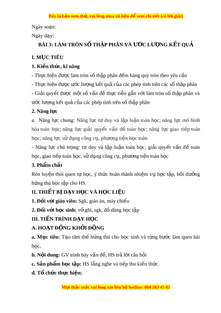 Đây là bản xem th , vu ử i lòng mua tài li u ệ đ xe ể m chi ti t ế (có l i ờ gi i ả ) Ngày so n: ạ Ngày d y: ạ BÀI 3: LÀM TRÒN S Ố TH P Ậ PHÂN VÀ Ư C Ớ LƯ N Ợ G K T Ế QUẢ I. M C Ụ TIÊU 1. Ki n t ế h c, kĩ ứ năng - Th c