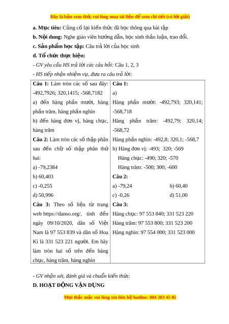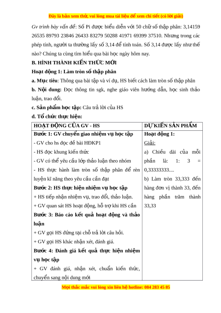 luyện kĩ năng theo yêu c u c ầ n đ ầ t ạ b) Làm tròn 33,333 đ n ế Bư c ớ 2: HS th c hi ự n nhi ệ m ệ v h ụ c t ọ p ậ hàng đ n ơ vị thành 33, đ n ế + HS ti p ế nh n nhi ậ m ệ v , t ụ rao đ i ổ , th o ả lu n. ậ hàng ph n ầ trăm thành + GV quan sát HS ho t ạ đ ng, ộ h t ỗ r khi ợ HS c n ầ 33,33 Bư c ớ 3: Báo cáo k t ế quả ho t ạ đ ng ộ và th o ả luận + GV g i ọ HS đ ng ứ t i ạ ch t ỗ r l ả i ờ câu h i ỏ . + GV g i ọ HS khác nh n xét ậ , đánh giá. Bư c ớ 4: Đánh giá k t ế quả th c ự hi n ệ nhi m ệ vụ h c t ọ ập + GV đánh giá, nh n ậ xét, chu n ẩ ki n ế th c, ứ chuy n s ể ang n i ộ dung m i ớ M i ọ thắc m c