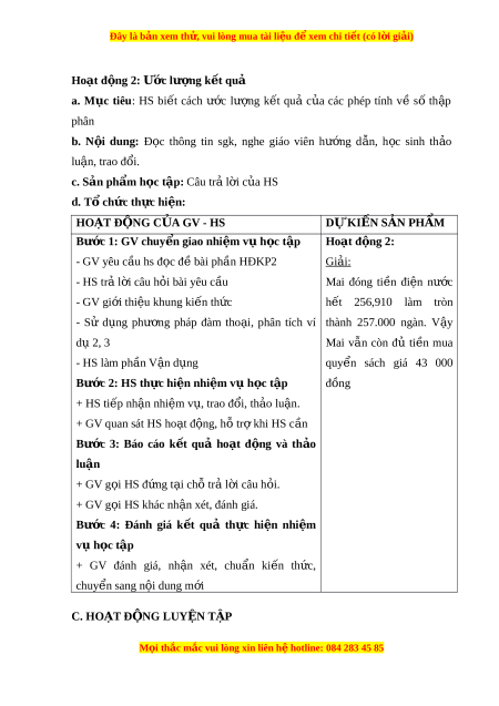Đây là bản xem th , vu ử i lòng mua tài li u ệ đ xe ể m chi ti t ế (có l i ờ gi i ả ) Hoạt đ ng ộ 2: Ư c l ớ ư ng k ợ t ế quả a. M c ụ tiêu: HS bi t ế cách ư c ớ lư ng ợ k t ế quả c a