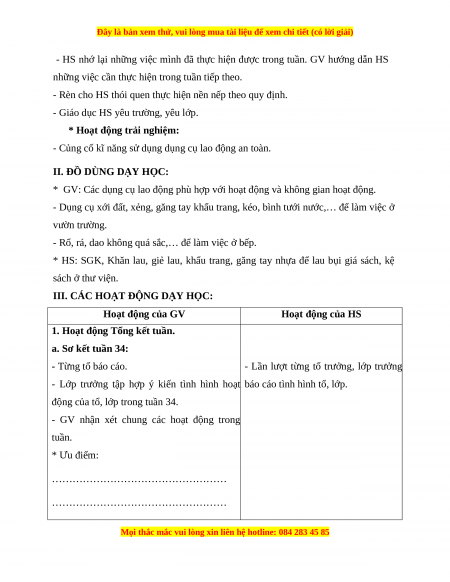 1. Hoạt động Tổng kết tuần. a. Sơ kết tuần 34: